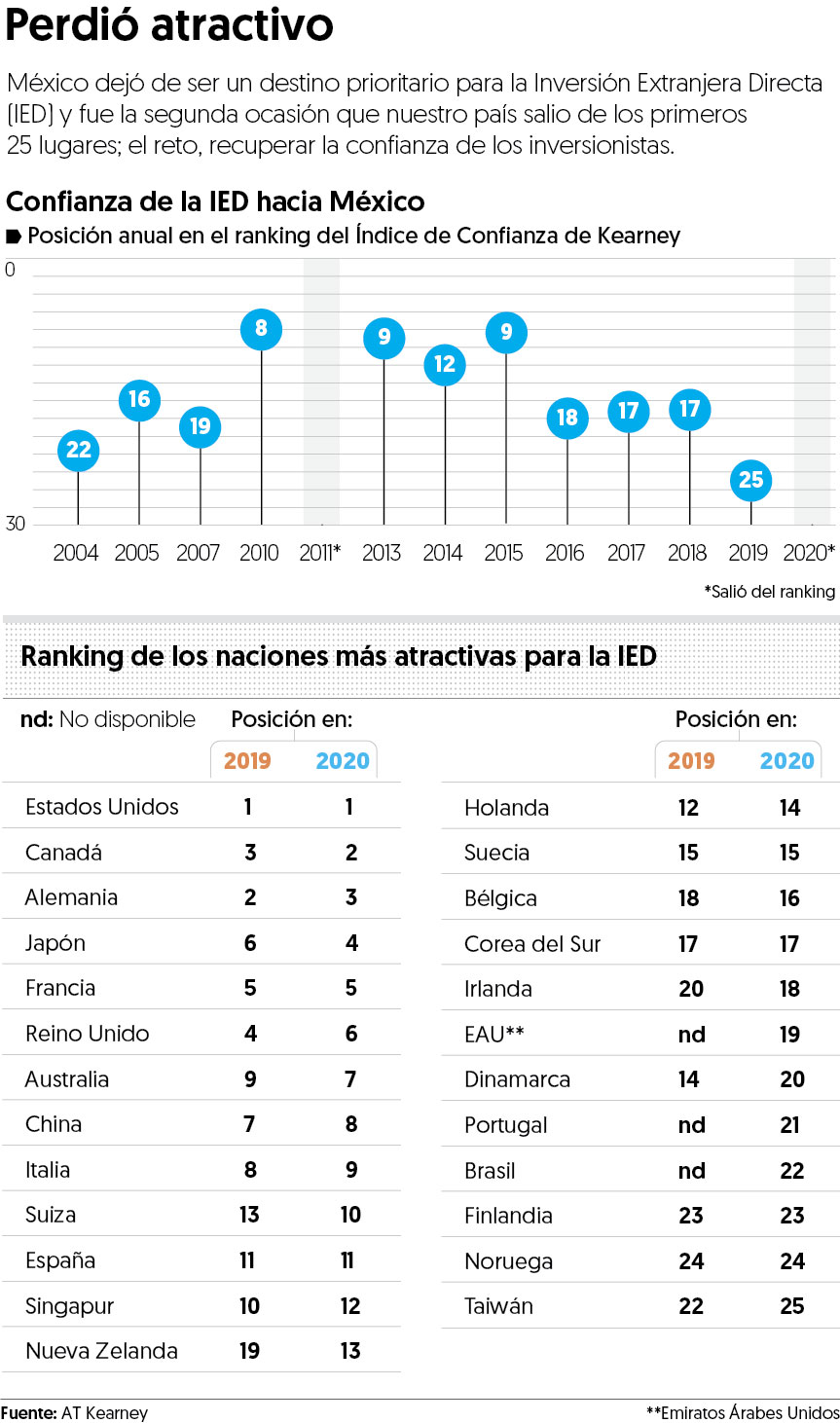 CIUDAD DE MÉXICO.- El Índice de Confianza de Inversión Extranjera Directa (IED) Kearney 2020 reveló que México ya no se encuentra en los 25 destinos prioritarios a nivel mundial.