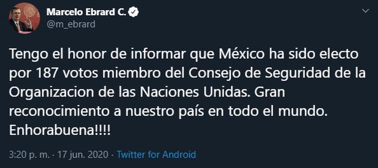 “Tengo el honor de informar que México ha sido electo por 187 votos miembro del Consejo de Seguridad de la Organización de las Naciones Unidas. Gran reconocimiento a nuestro país en todo el mundo. Enhorabuena!!!!”.