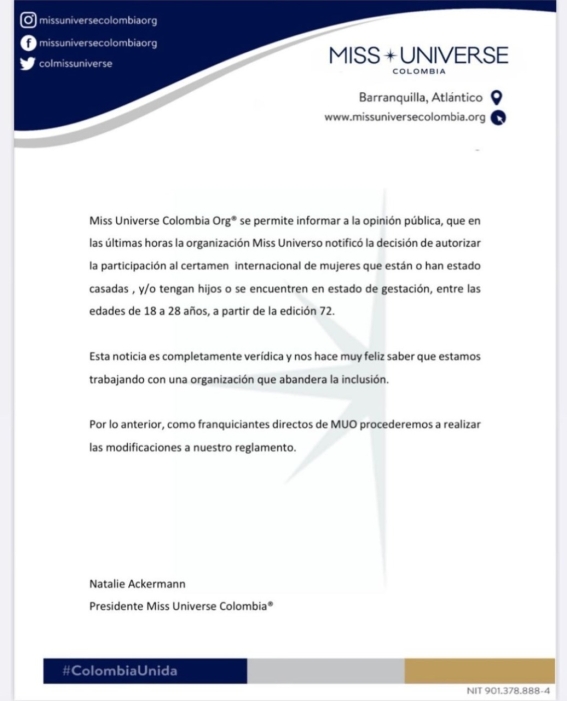 BARRANQUILLA, Colombia.- A través de un comunicado oficial, Miss Universo anunció que a partir del próximo año, mujeres que estén o hayan estado casadas, embarazadas con que tengan hijos, también podrán ser partes del certamen de belleza. En el comunicado también se lee que las candidatas deben estar en un rango de edad entre los 18 y 28 años.