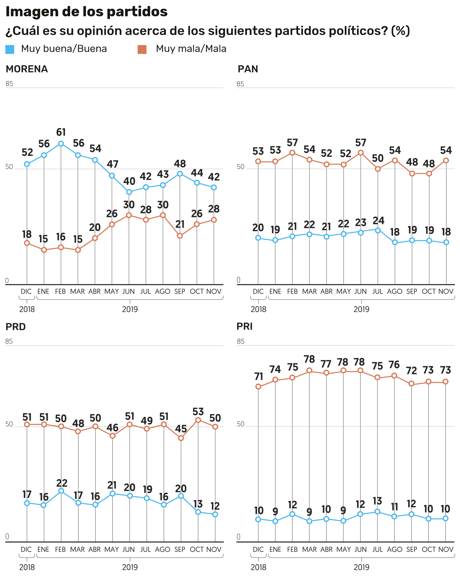 El PAN cuenta con 18 por ciento de opinión favorable y 54 por ciento desfavorable, mientras que el PRD tiene 12 por ciento de opiniones favorables y 50 por ciento desfavorables.