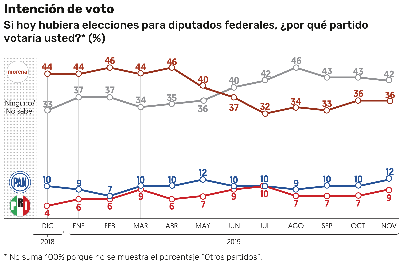Mientras la intención de voto por el partido gobernante se ha reducido, quien ha ganado terreno son los electores indefinidos, los que no votarían por ninguno de los partidos o no saben aún. La proporción de indefinidos empezó en 33 por ciento en diciembre de 2018, subió hasta 46 por ciento en agosto y registró 42 por ciento en noviembre. Así lo revela la serie de encuestas nacionales telefónicas de El Financiero, realizadas mensualmente desde diciembre de 2018 a noviembre de 2019.