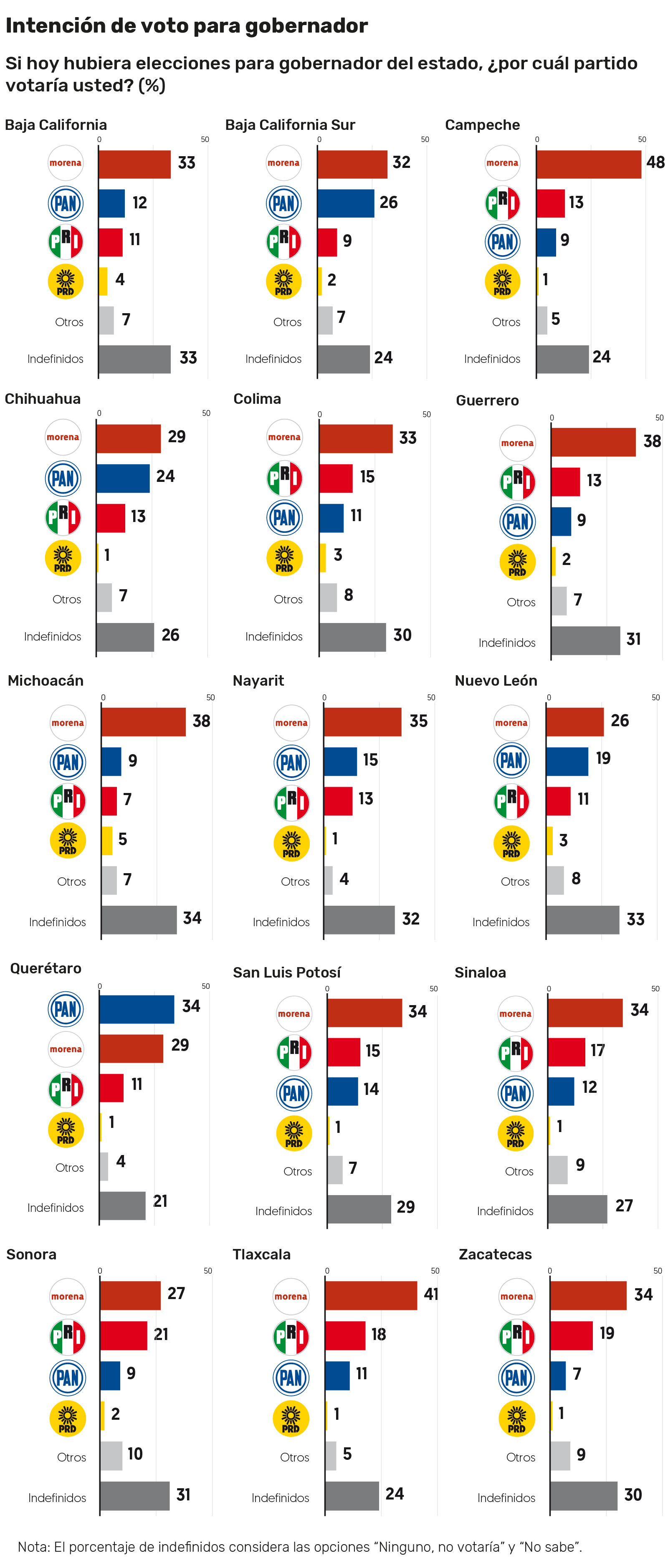 Las entidades en las que Morena cuenta con mayor apoyo son Campeche (48 por ciento), Tlaxcala (41 por ciento), Michoacán y Guerrero (38 por ciento en cada una); y donde menos apoyo a Morena se observa es en Nuevo León (26 por ciento), Sonora (27 por ciento), Chihuahua y Querétaro (29 por ciento, en cada una).
