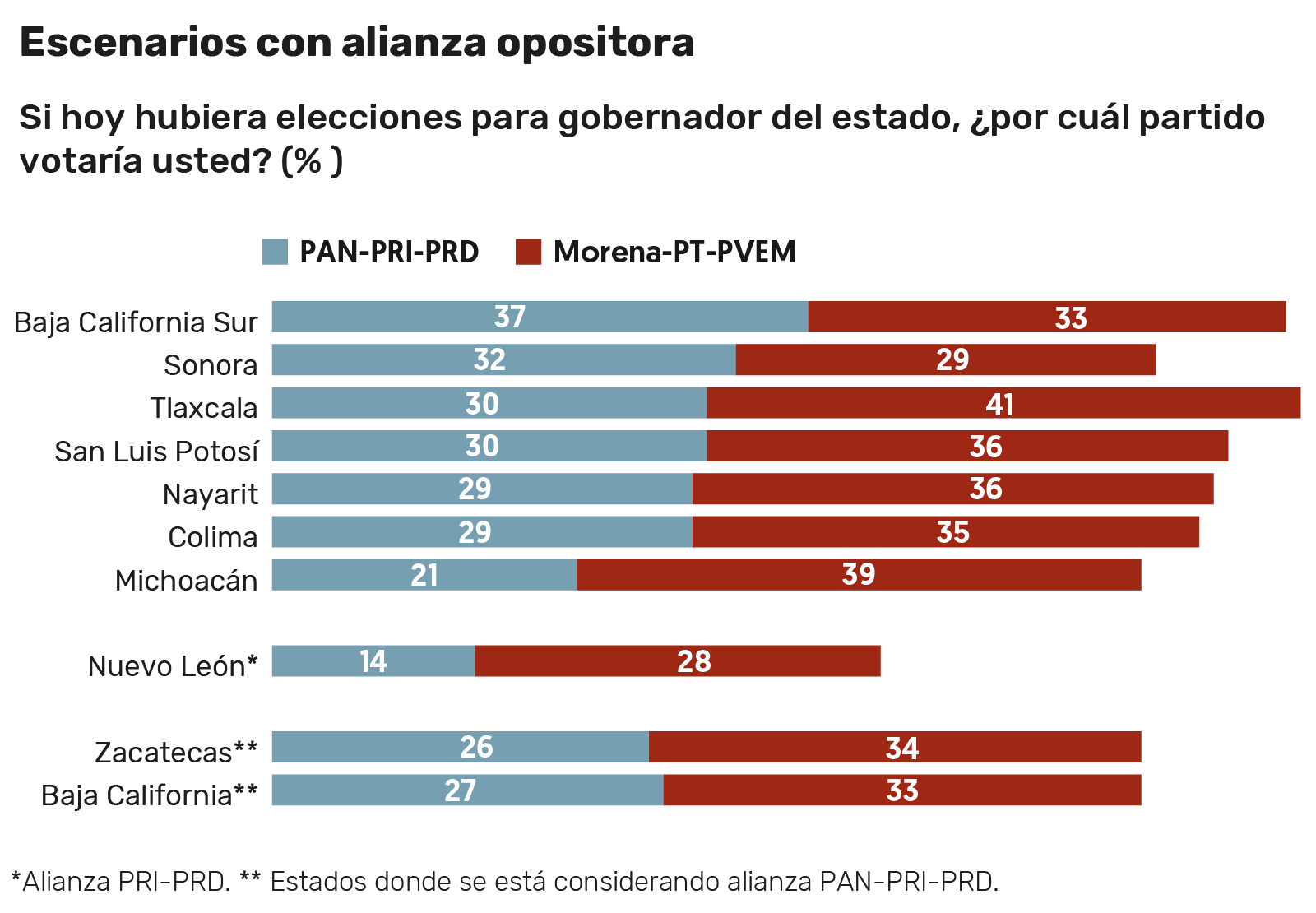 La alianza PAN-PRI-PRD se ha anunciado en 7 entidades y en dos más está pendiente su confirmación. En dos de ellas, Baja California Sur y Sonora, la alianza opositora se ubica por arriba de Morena sumando las preferencias de manera aritmética, con diferencias de 4 y 3 puntos, respectivamente.