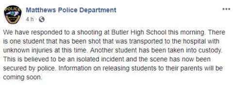 Hace unas horas, la policía de Carolina del Norte dio a conocer que un estudiante asesinó a otro con un arma de fuego en el colegio Butler High School.