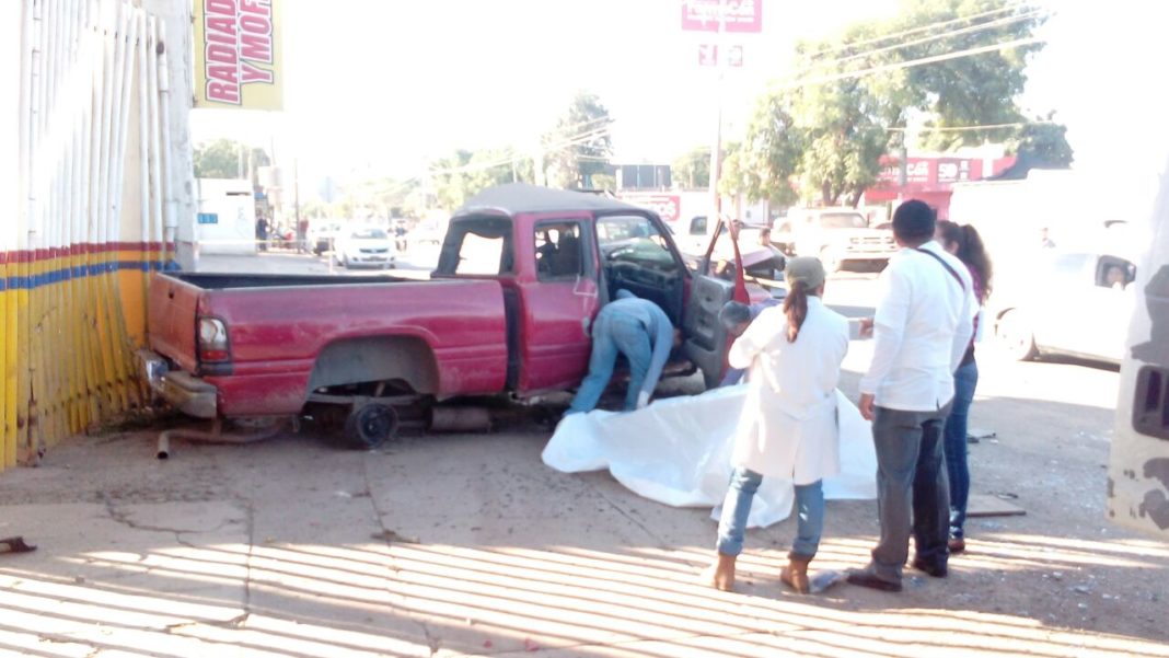 El occiso identificado como José Juan con domicilio en El Mirador circulaba de sur a norte por la avenida cuando la camioneta pick-up en que viajaba perdió el control del volante y se impactó de costado contra la fachada de un taller de mofles y radiadores.