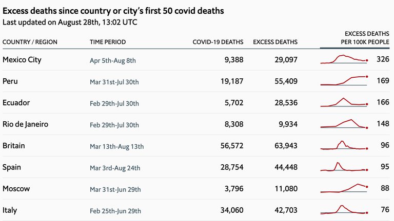 Tomó los datos, en particular de la Ciudad de México para incluir al país en el estudio. Entre el 5 de abril y el 8 de agosto, en la capital se registraron 9 mil 388 muertes por COVID-19. En realidad, el “exceso de muertes” en ese periodo, dice The Economist, es de 29 mil 097.