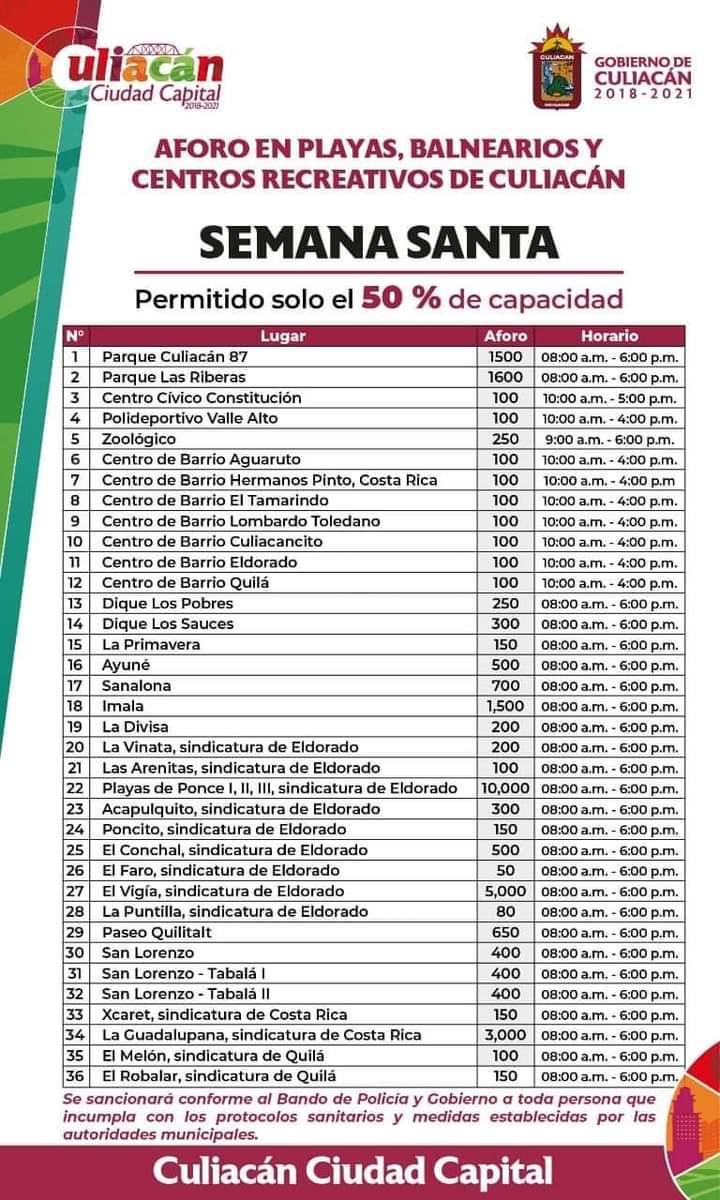 CULIACÁN, Sin.- Como medida de prevención de contagios por COVID-19 durante esta Semana Santa, el aforo en playas, centros recreativos y balnearios del municipio será del 50 por ciento de la capacidad de cada uno de los espacios, y con horarios regulados.