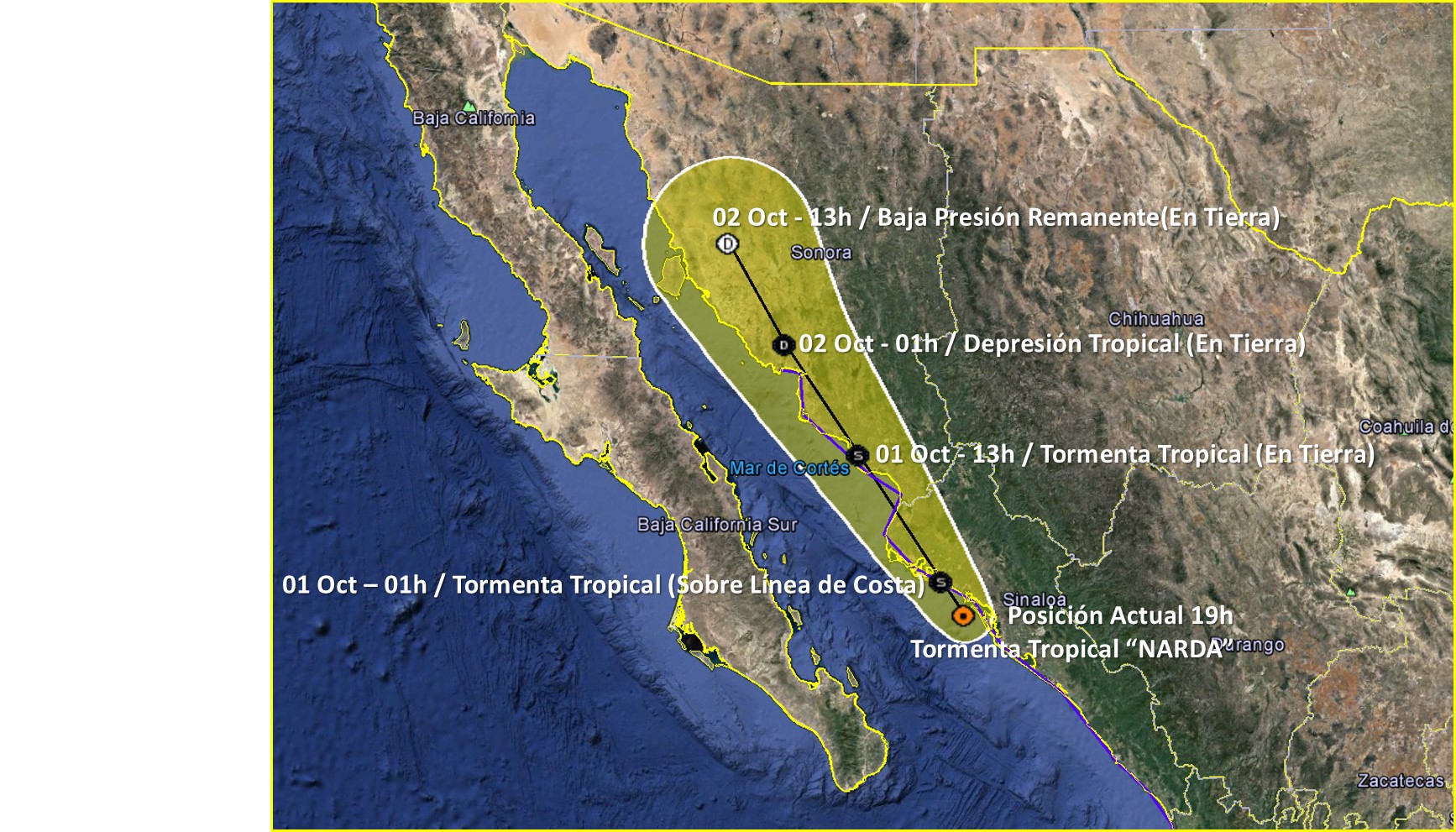 CIUDAD DE MÉXICO.- El centro de la Tormenta Tropical “Narda“ continúa desplazándose frente a la costa norte de Sinaloa.