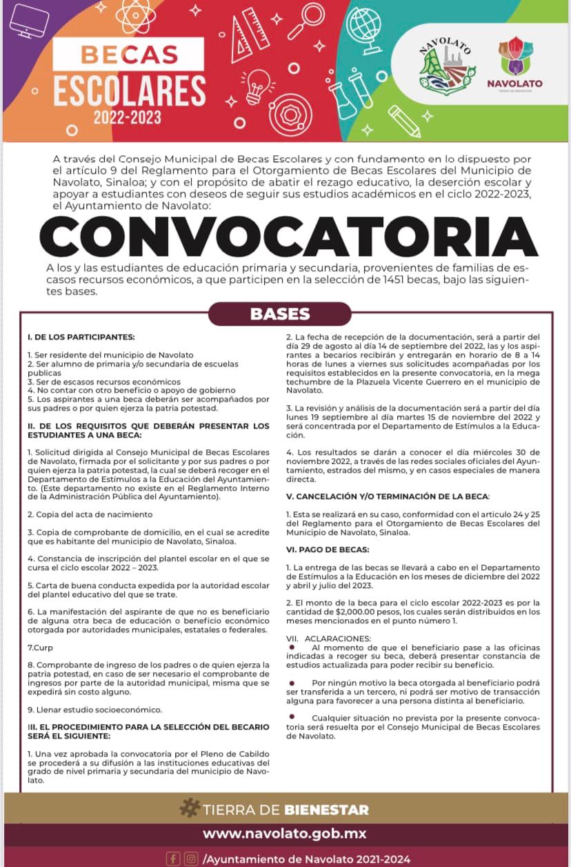 NAVOLATO, Sin.- Con el objetivo de abatir el rezago educativo y motivar a estudiantes que necesitan de apoyo económico para continuar sus estudios, el Consejo Municipal de Becas abrió hoy la convocatoria para que alumnos de escuelas primarias y secundarias públicas puedan participar para obtener una beca escolar para el ciclo 2022-2023.