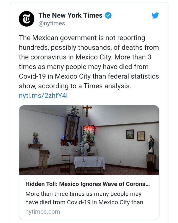 El NYT indicó que el gobierno mexicano no está informando cientos, posiblemente miles, de muertes por Covid-19 en la Ciudad de México; incluso habló de funcionarios despedidos que han estimado que la cifra sería tres veces mayos.