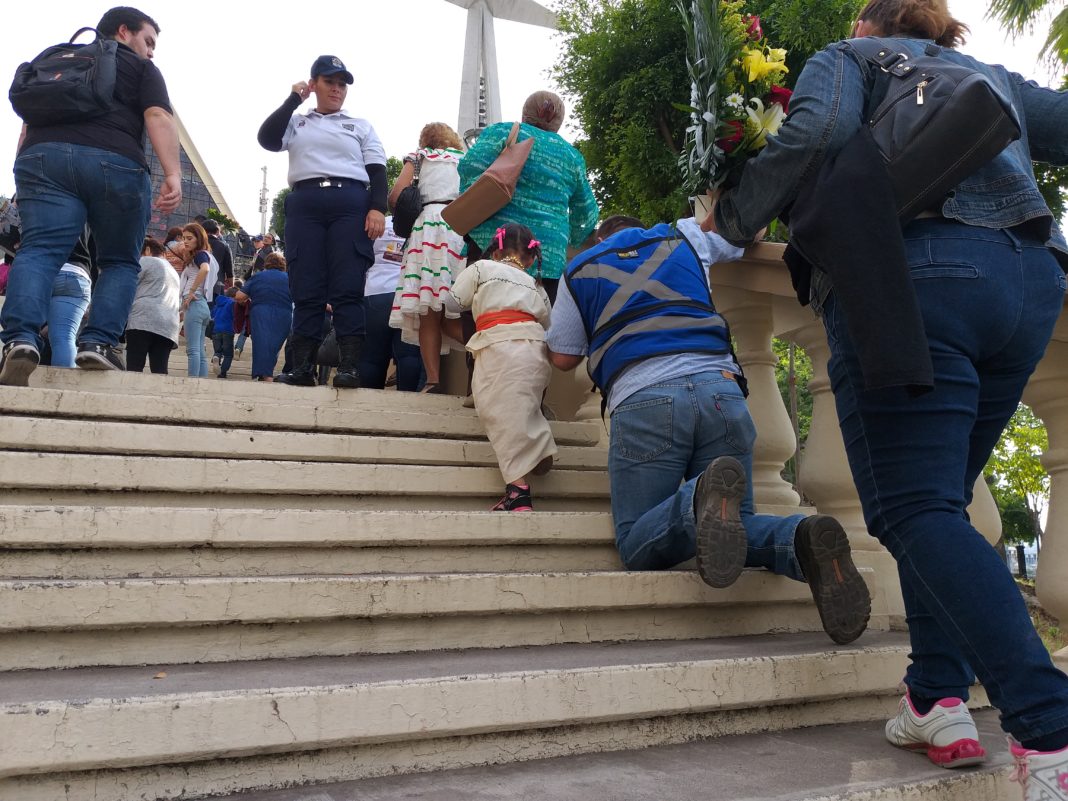 “Subir las escalinatas de rodilas, se cumplió y hay que cumplirle”, dijo Dario López Cebreros evidentemente fatigado mientras abrazaba a su pequeña en un breve descanso rumbo al altar.