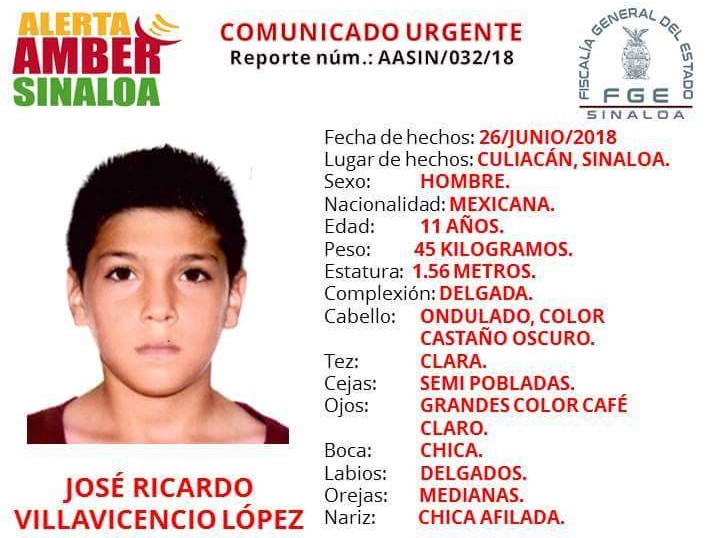 CULIACÁN, Sin.- Esta tarde fue girada la alerta Amber para localizar al niño José Ricardo Villavicencio López quien desapareció al salir de una tienda de conveniencia en la colonia Renato Vega de Culiacán.
