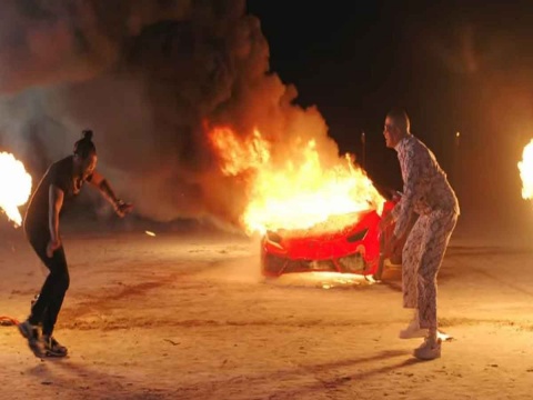 Al final del videocip de Bad Bunny y el El Alfa, publicado una semana antes del incidente, se observa cómo una joven arroja un bidón de gasolina sobre un coche deportivo y el cantante puertorriqueño le prende fuego con un mechero, incendiando el automóvil. Entonces aparece su colega dominicano y empiezan a bailar entre las llamas mientras repiten constantemente la palabra ‘fuego’ en español e inglés.
