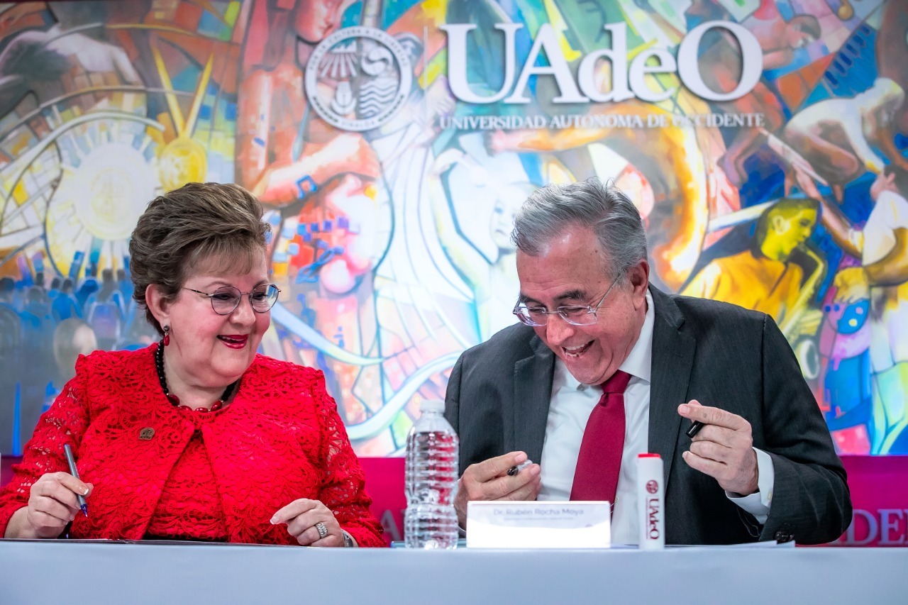 El mandatario estatal visitó el campus Culiacán de la Universidad Autónoma de Occidente, donde fue recibido por su rectora, Sylvia Paz Díaz Camacho, y demás autoridades universitarias, para suscribir un convenio marco con esta institución cuyo propósito es establecer bases de cooperación para el desarrollo conjunto de actividades de docencia, de educación continua, extensión cultural y capacitación.