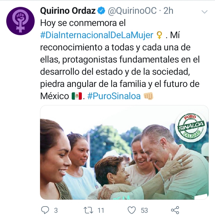CULIACÁN, Sin.- No he visto mujeres más echadas para adelante que las de Sinaloa, escribió hoy el gobernador de Sinaloa en el marco de la conmemoración del Día Internacional de la Mujer.