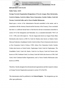 Departamento de Estado argumentó en los cárteles un riesgo para la seguridad nacional, la política exterior y los intereses económicos de la nación.
