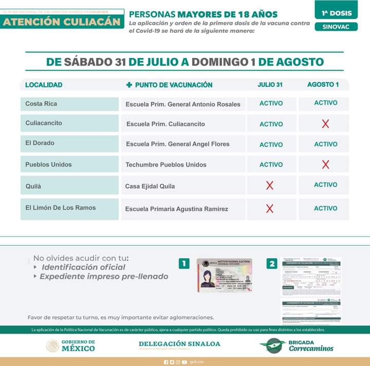 CULIACÁN, Sin.- El próximo sábado 31 al domingo 1 de agosto iniciará la aplicación de la primera dosis de vacuna Sinovac contra COVID-19 para los jóvenes de 18 años cumplidos o más.