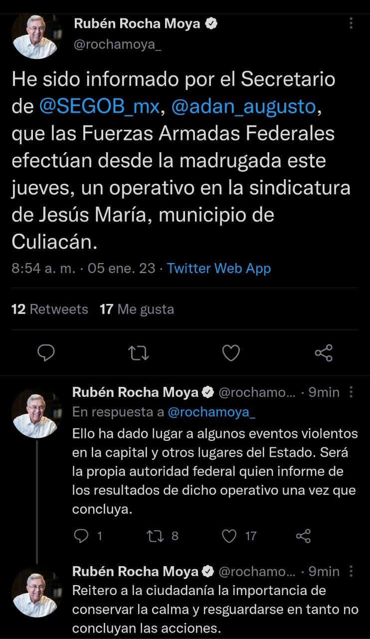 CULIACÁN, Sin.- El gobernador del Estado, Rubén Rocha Moya, anunció a las 08:54 horas de forma oficial que el secretario de Gobernación, Adán Augusto López, le informó que las fuerzas federales mantienen desde la madrugada de este jueves un operativo en la sindicatura de Jesús María.