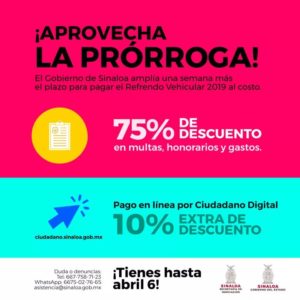 CULIACÁN, Sin.- El gobierno del estado confirmó la prórroga de una semana más con descuento al 75 por ciento en refrendo vehicular por multas, honorarios y gastos.