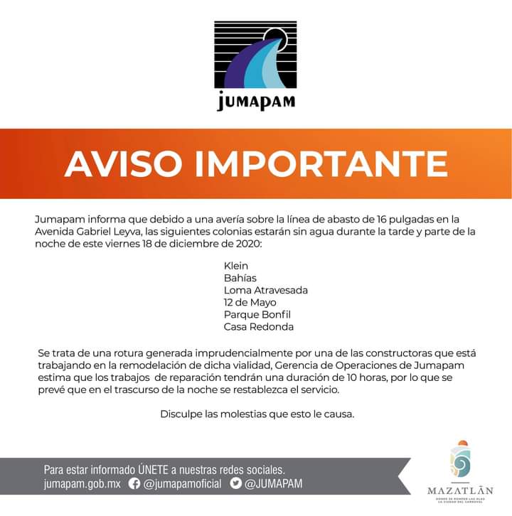 Se estima que la situación se prolongue por lo menos 10 horas a partir de las 16:00 horas, informó la Junta de Agua Potable y Alcantarillado de Mazatlán.