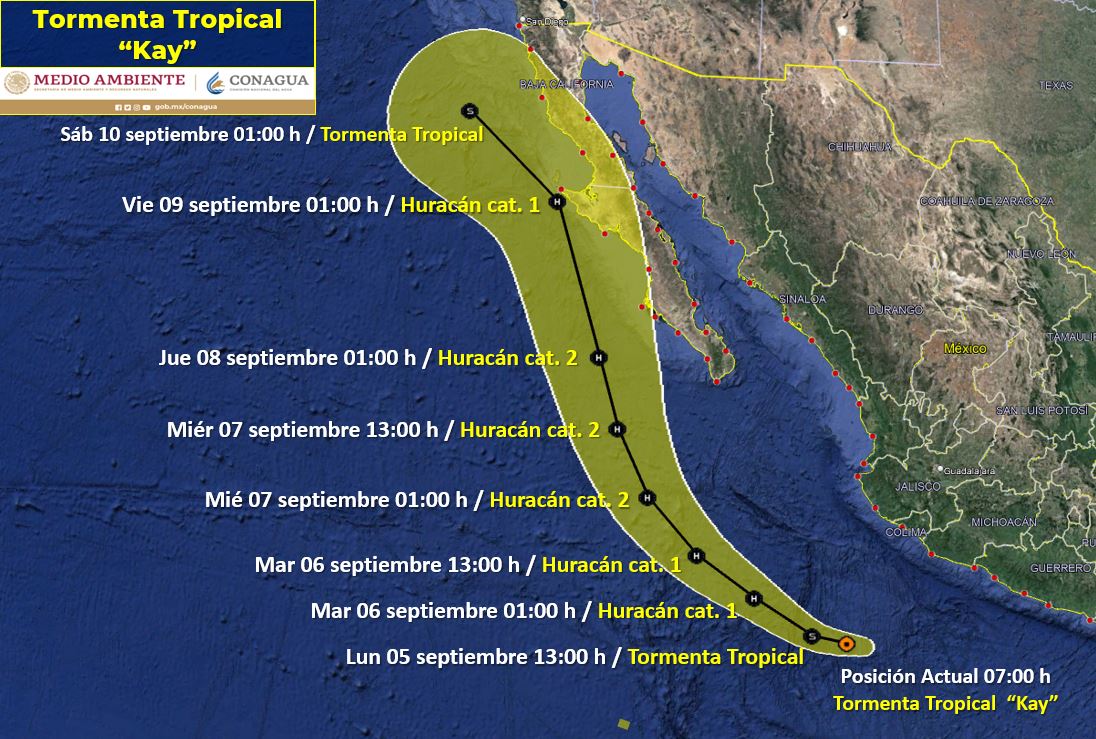 Las extensas bandas nubosas de la tormenta tropical Kay originarán lluvias torrenciales (de 150 a 250 milímetros) en zonas de Nayarit y Sinaloa, intensas (de 75 a 150 milímetros) en regiones de Colima, Jalisco y Michoacán, muy fuertes (de 50 a 75 milímetros) en localidades de Guerrero.