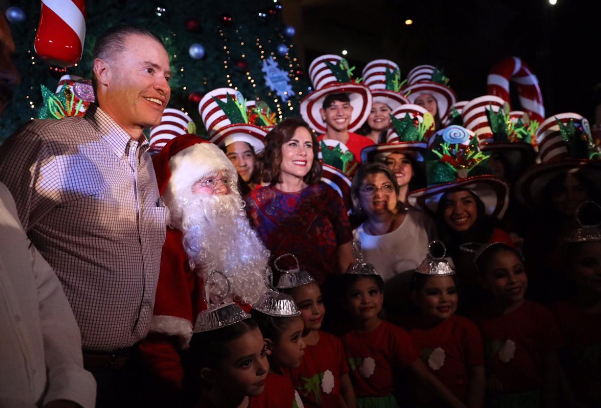 CULIACÁN, Sin.- En un ambiente de alegría, impregnado por el espíritu navideño, el gobernador Quirino Ordaz Coppel y su esposa, Rosy Fuentes de Ordaz, encendieron el monumental Árbol de Navidad con el cual quedó abierta la Villa Navideña que ocupa toda la explanada de Palacio de Gobierno, donde este primer día se dieron cita alrededor de cinco mil personas, en su inmensa mayoría familias enteras con sus hijos.