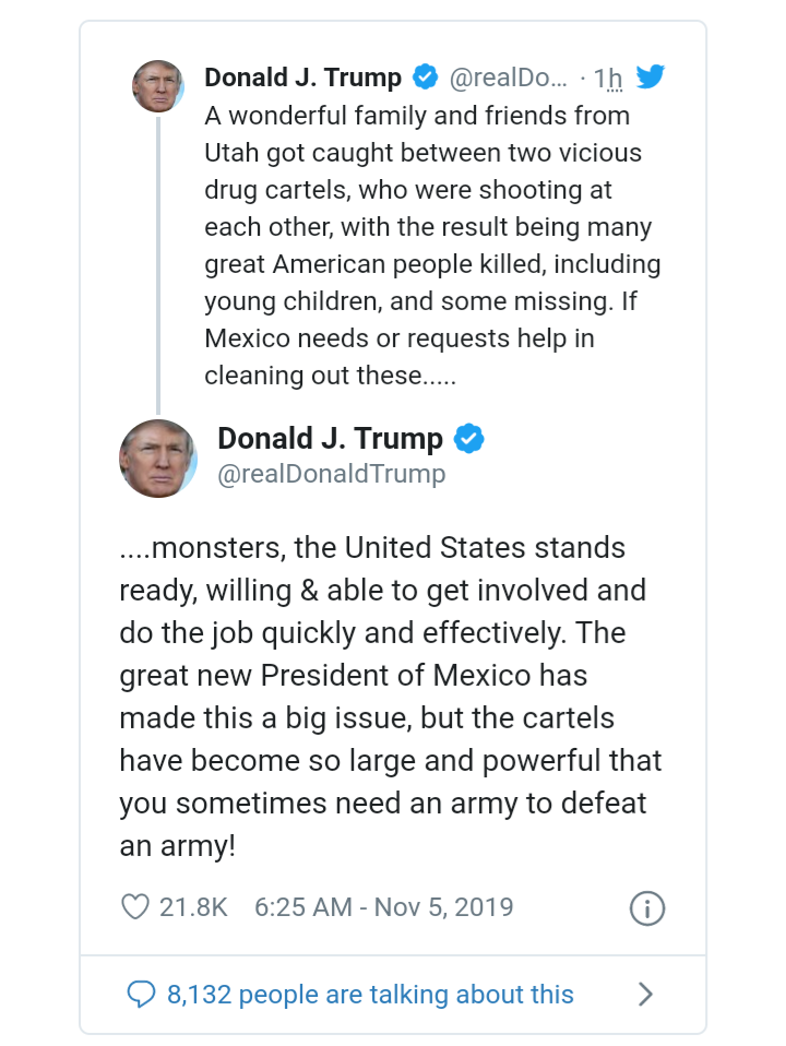 “Es un asunto que nos corresponde a nosotros atender, al gobierno de México, de manera independiente y haciendo valer nuestra soberanía. Le agradecemos mucho, mucho, al presidente Trump que quiera cooperar y quiera ayudar, pero en estos caso nosotros tenemos que actuar con independencia”, dijo.