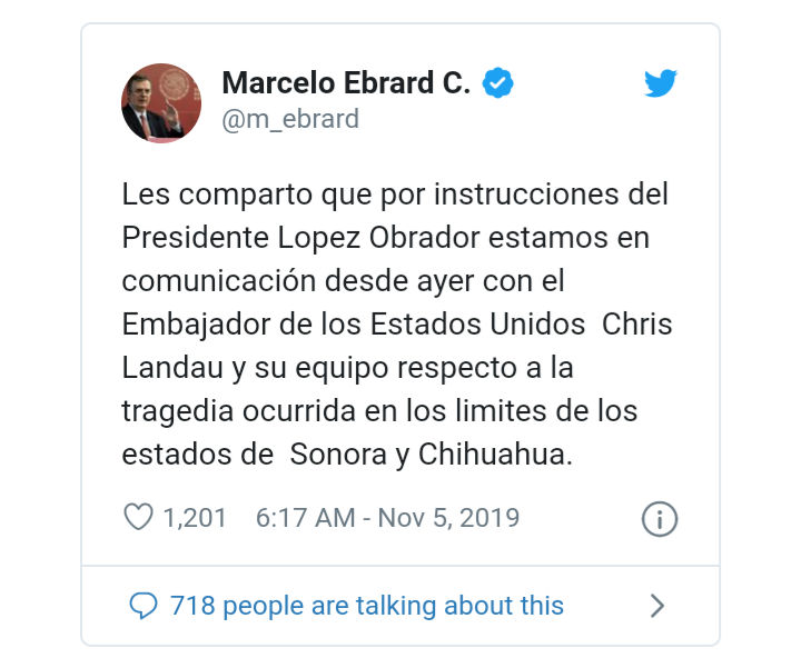 El canciller de México, Marcelo Ebrard, informó que desde el lunes 4 de noviembre, la Secretaríá de Relaciones Exteriores se puso en contacto con la Embajada de Estados Unidos en México para atender el caso de la familia asesinada.