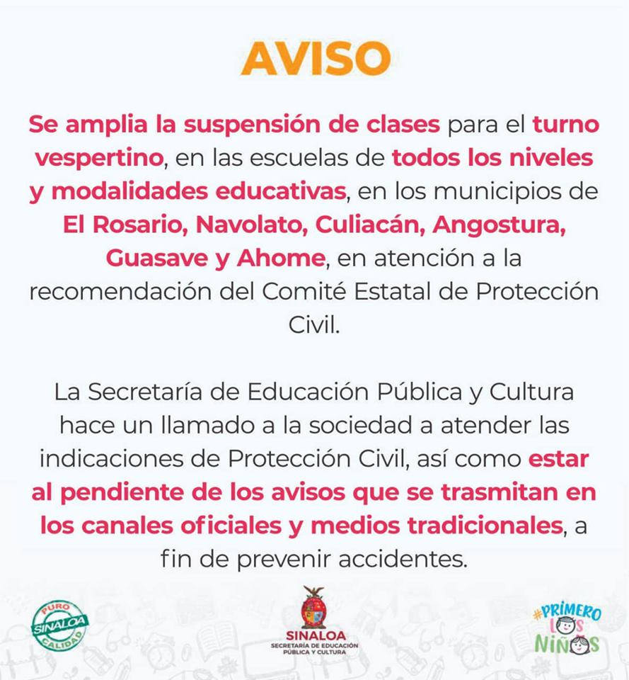 Los puertos (Altata) y aeropuertos menores (Navolato, Villa Juárez y Sataya) fueron cerrados a la navegación hasta nuevo aviso.