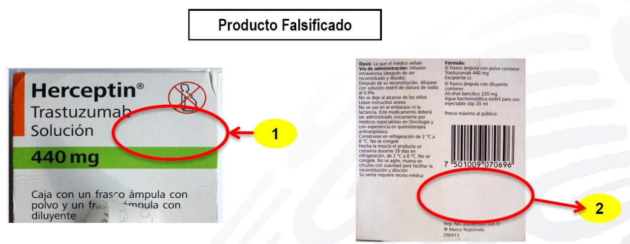 Informó que, a nivel nacional, la Cofepriss ha realizado una investigación a partir de la denuncia presentada por Laboratorios Roche, S.A. de C.V., por la falsificación del producto Herceptin (Trastuzumab) 440 mg Frasco ámpula.