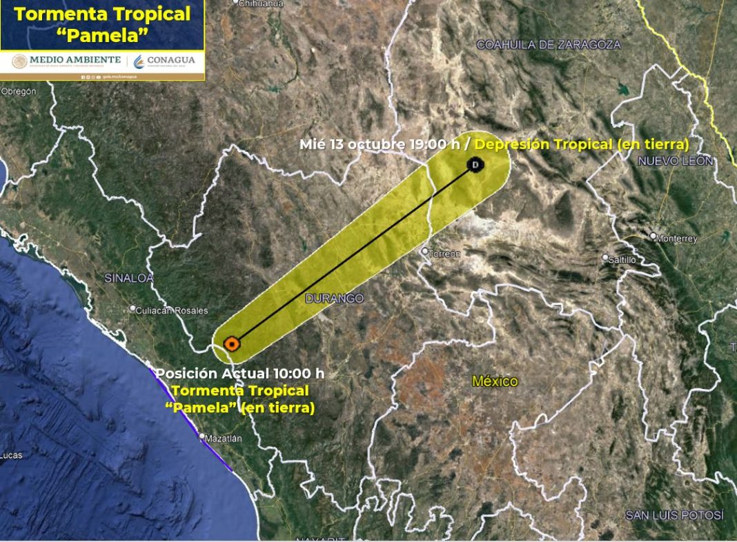 CIUDAD DE MÉXICO.- “Pamela” ahora como tormenta tropical. Sus bandas nubosas ocasionan lluvias fuertes a puntuales intensas y rachas fuertes de en el noroeste y occidente de México, además de oleaje elevado en Sinaloa y Nayarit.