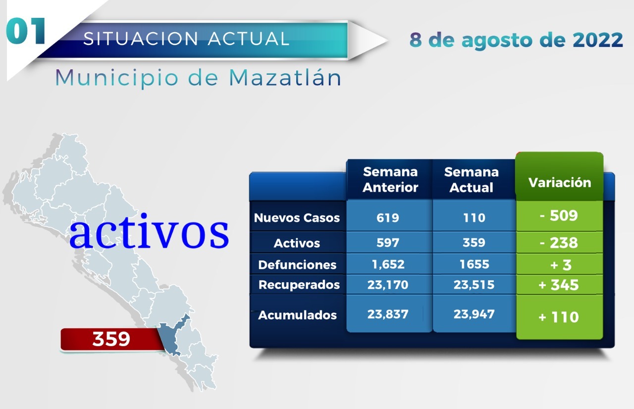 MAZATLÁN, Sin.- Los casos COVID en el puerto de Mazatlán continúan registrándose a la baja, según datos de la última actualización de la plataforma. El municipio registró 25.8 grados en el termómetro municipal COVID con 359 los casos activos en Mazatlán.