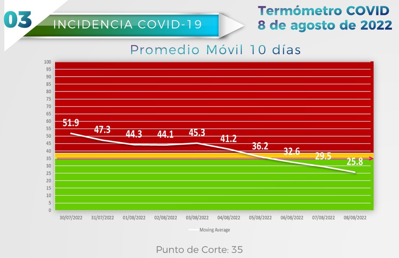 Actualmente, el municipio registra 345 recuperados, 110 nuevos casos y 3 defunciones, por lo que desciende al color verde, ya que en este momento cuenta con niveles inferiores a los del año anterior y casi iguales a los del inicio de la pandemia en la misma fecha.