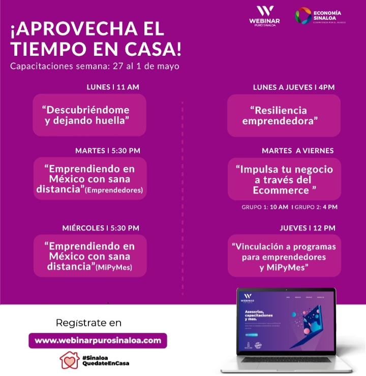Entre las acciones que el gobierno de Sinaloa que encabeza Quirino Ordaz Coppel ha puesto en marcha a través de la Secretaría de Economía, en apoyo a las micro, pequeñas y mediana empresas, están las capacitaciones en línea, es por ello que se ha creado la plataforma WebinarPuroSinaloa, donde recibirán cursos gratuitos con valor curricular.