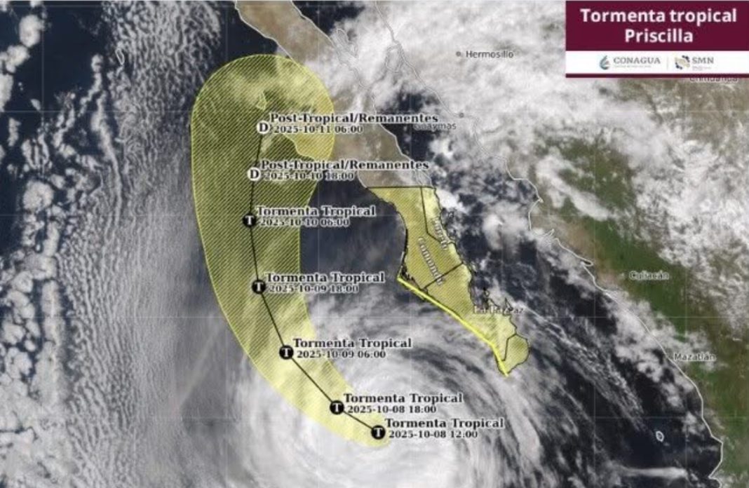 CULIACÁN, Sin.- Esta tarde Priscilla se debilitó a tormenta tropical. Presenta vientos máximos de 110 km/h con rachas de 140 km/h y se ubica a 315 km al oeste-suroeste de Cabo San Lucas, BCS. Se prevé que continúe debilitándose gradualmente.