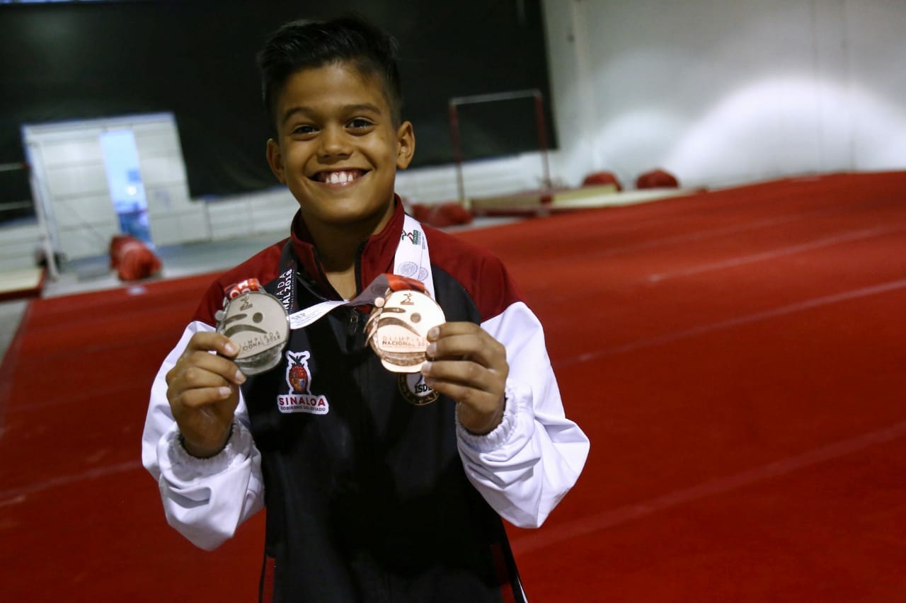 El pequeño de 10 años que participa en su primera Olimpiada Nacional demostró su calidad, colgándose el metal de plata en el salto de caballo en triple empate al totalizar 9.133 unidades, subieron por la plata de igual manera Jonathan López de Baja California y Lander Papadakis de Colima.