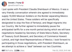 El presidente Trump calificó la conversación como “muy amistosa” y confirmó que los aranceles a México están pausados por un mes.