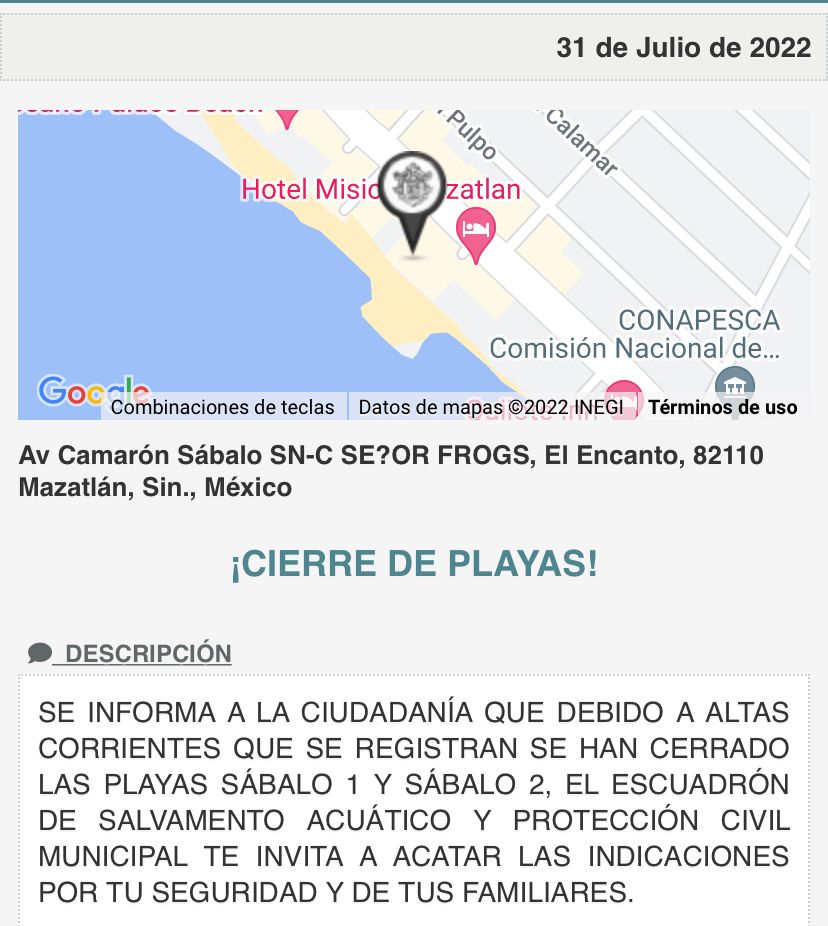MAZATLÁN, Sin.- Debido al alto oleaje y corrientes de retorno que se presentan, las zonas de playa Sábalo 1 y Sábalo 2 fueron cerradas a los bañistas (a la altura del hotel Pueblo Bonito).