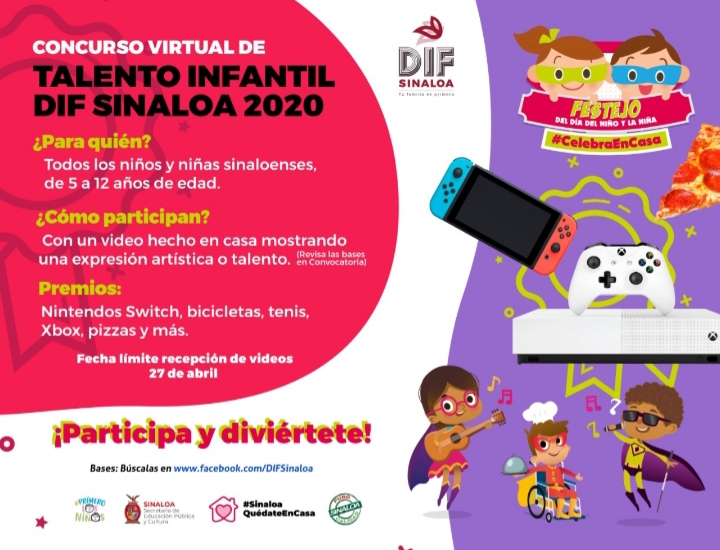 CULIACÁN, Sin.- Ante la emergencia de salud que se vive en el estado, el Sistema DIF Sinaloa, que preside Rosy Fuentes de Ordaz, busca celebrar de manera diferente y desde casa el día del Niño y la Niña, invitando a participar en el Concurso Virtual de Talento Infantil 2020.