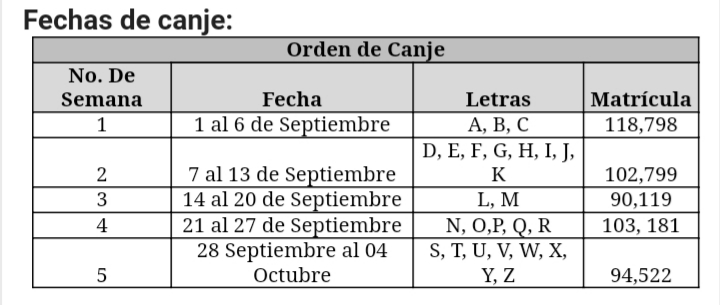 Explicó que la modalidad de canje será de acuerdo a un orden alfabético, durante cinco semanas, y a partir del 1 al 6 de septiembre acudirán los padres de alumnos cuya primera letra de su apellido paterno sea A, B y C; del 7 al 13 de septiembre, las letras D, E, F, G, H, I, J, K; del 14 al 20 del mismo mes, las letras L y M; del 21 al 27, las letras N, O, P, Q, R; y finalmente del 28 de septiembre al 4 de octubre, las letras S, T, U, V, W, X, Y, Z.