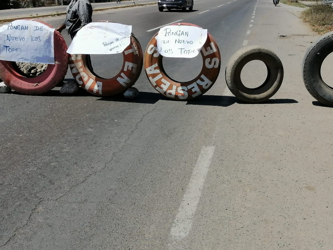 Habían sido retirados por la dirección de Obra Pública del municipio la semana pasada. A las 09:00 horas los pobladores en señal de exigencia cerraron los carriles laterales de cada sentido con llantas, lo que obligó a los automovilistas a reducir su velocidad.