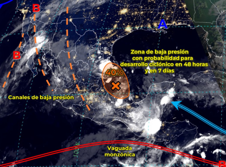 Para hoy, la vaguada monzónica que se extenderá sobre el sureste y sur del territorio nacional en interacción con inestabilidad atmosférica en altura,ocasionarán lluvias puntuales torrenciales en Tamaulipas, Nuevo León, San Luis Potosí y Veracruz.