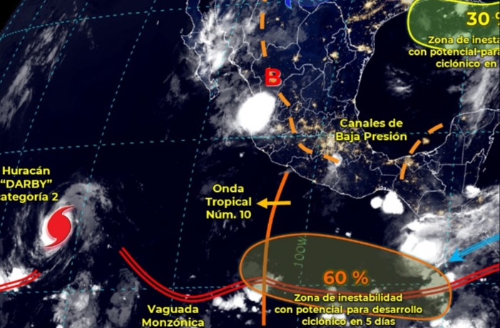 CIUDAD DE MÉXICO.- Para este lunes el monzón mexicano e inestabilidad en niveles altos de la atmósfera ocasionarán lluvias puntuales muy fuertes con posibles granizadas en regiones de Sonora, Chihuahua, Sinaloa.