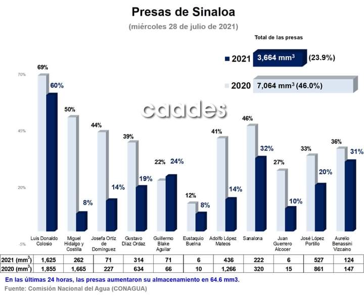 CULIACÁN, Sin.- Este miércoles las presas de nuestra entidad tienen 3,664 Mm3, lo que refiere un aumento de 64.6 Mm3 en las últimas 24 horas.