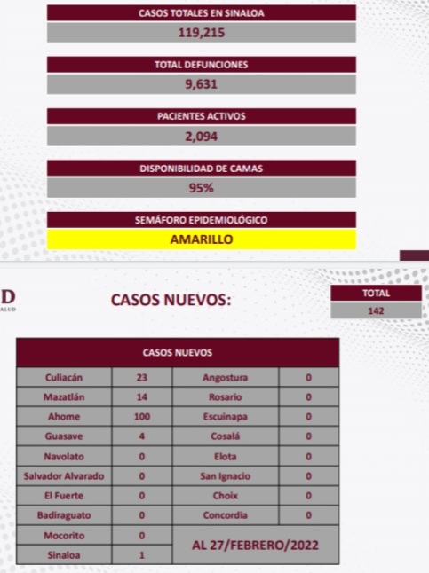 CULIACÁN, Sin.- Este domingo la Secretaría de Salud reportó cero defunciones por COVID-19, además de 142 casos nuevos, las cifras más baja en las ultimas dos semanas.
