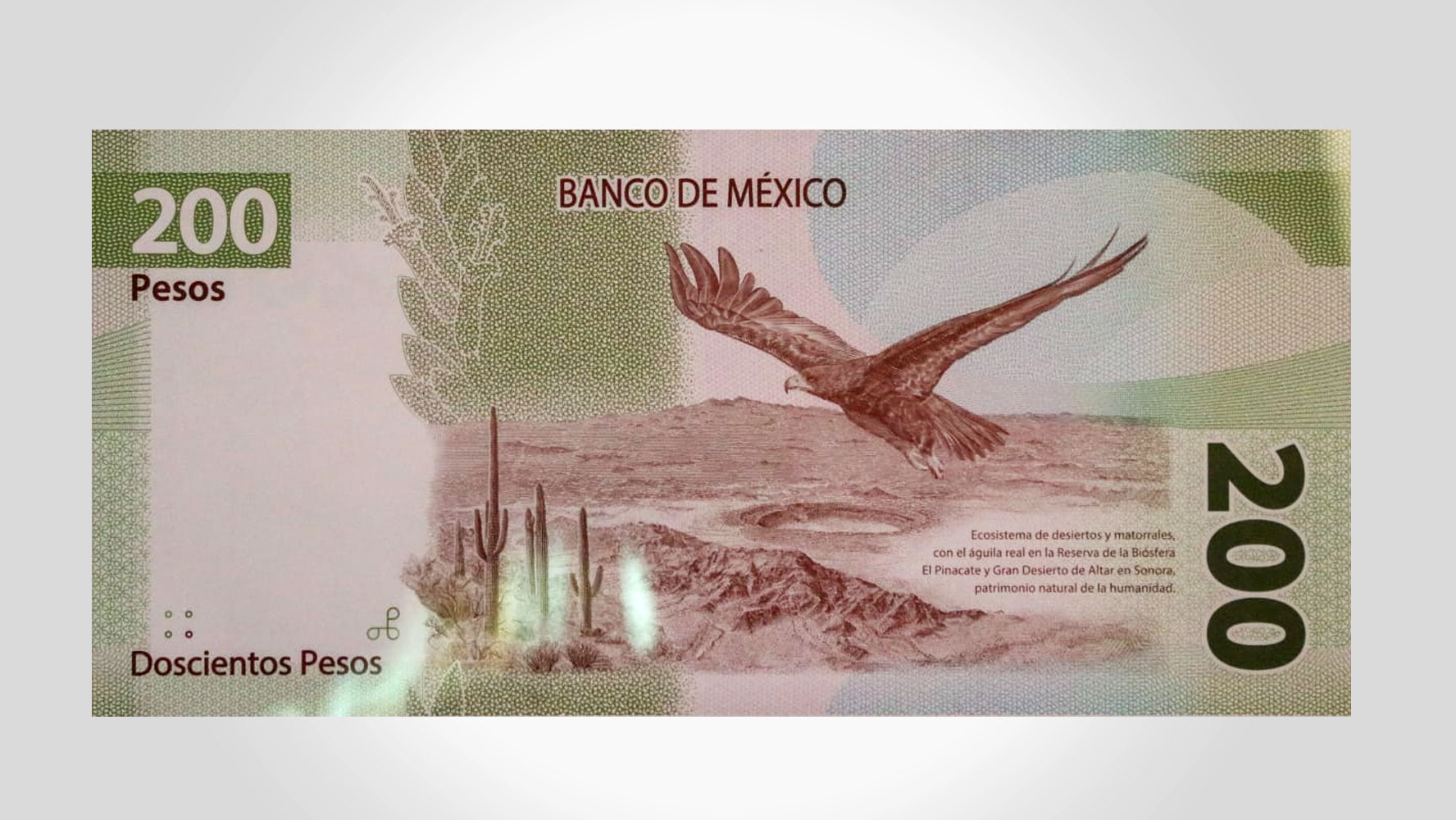 En esa cara, el billete presenta la Reserva de la Biosfera El Pinacate y Gran Desierto de Altar, ubicada en Sonora. Así como un águila real.