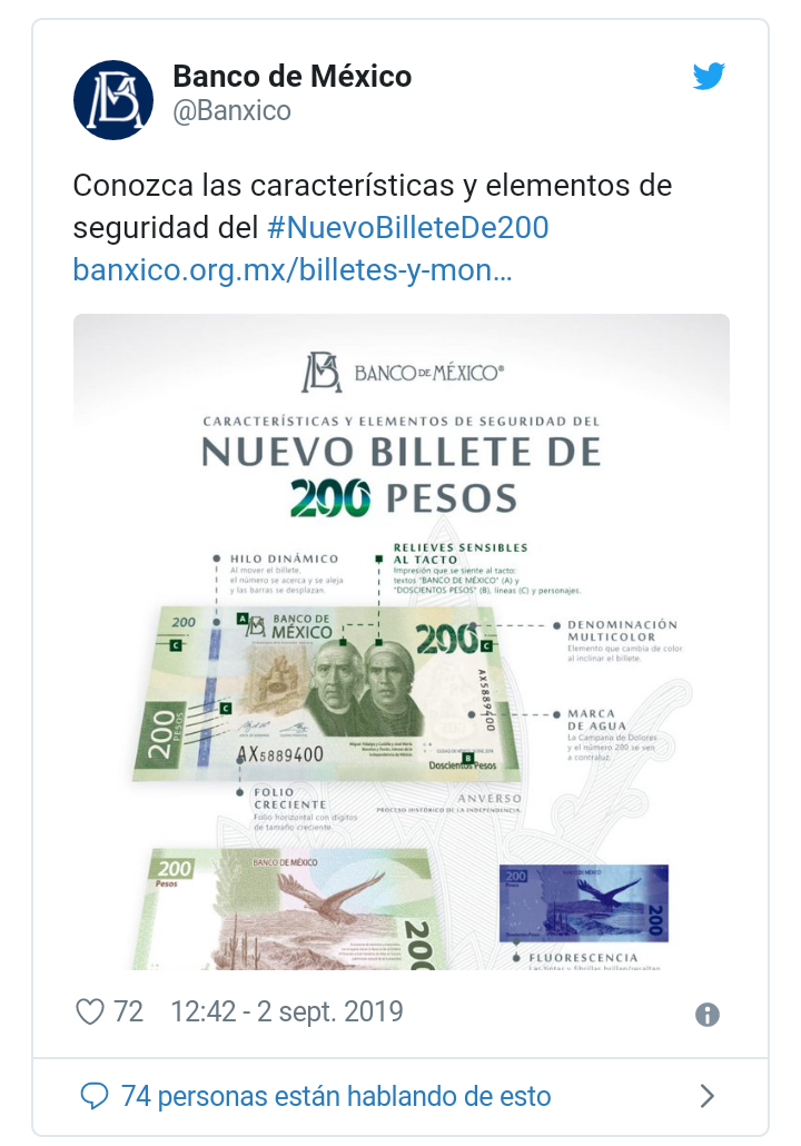 Apuntó que el billete de 200 pesos es el segundo más falsificado, después del de 500, por eso fue el segundo en ponerse en circulación de esa nueva familia.
