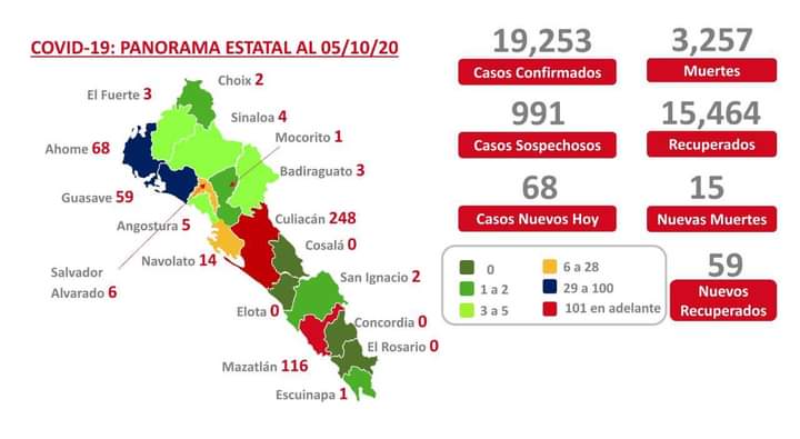 *Muertes* 3,257 (15 nueva Culiacán 7, Mazatlán 3, Ahome 2, Guasave 1, Mocorito 1, Escuinapa 1)