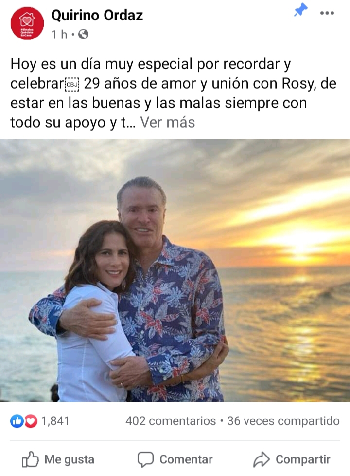 “Hoy es un día muy especial por recordar y celebrar 29 años de amor y unión con Rosy, de estar en las buenas y las malas siempre con todo su apoyo y tener como frutos tres maravillosos hijos.