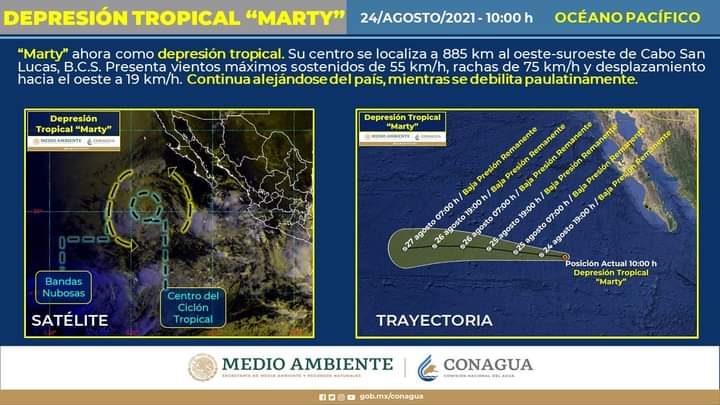 CULIACÁN, Sin.- “Marty” se degradó a depresión tropical, su centro se localiza a 885 kilómetros al oeste-suroeste de Cabo San Lucas, Baja California Sur.